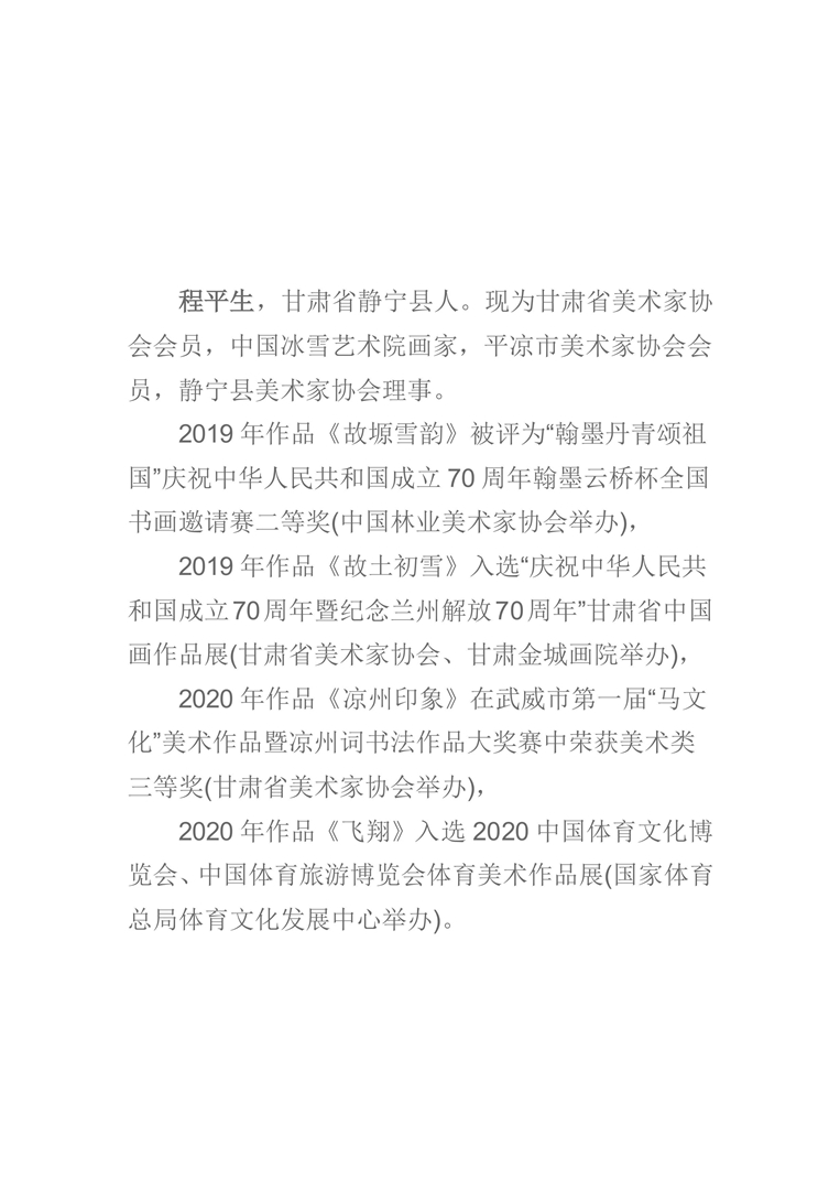 程平生,甘肃省静宁县人。现为甘肃省美术家协会会员,中国冰雪艺术院画家,平凉市美术家协会会员,静宁县美术家协会理事。